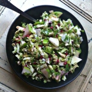 Growing up I never ate Brussels sprouts. I was that kid that heard the name and turned up my nose. Fish, Brussels sprouts, mushrooms—I just would not eat those things. Boy was I missing out! Looking back Brussels sprouts is one of those foods I wish I would have given a try. They are tasty when made the right way and healthy for you. Throw a little olive oil and balsamic in a pan and sauté them, or maybe a drizzle of lemon. Or make a salad, like this Shaved Brussels Sprout Salad with Apple and Pomegranate–you won’t be disappointed!