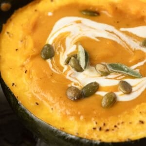You don’t have to serve this soup in an acorn squash bowl but it is a beautiful and fun way to serve a fall soup. It would be beautiful on a Thanksgiving or Christmas table.