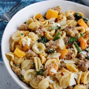 Butternut Squash Pasta is the perfect fall pasta dish mixing sausage, roasted butternut squash and pasta topped with freshly grated parmesan cheese and creamy butternut squash sage sauce. This is a comforting meal for those colder months!