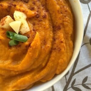 When I made this soup I kept it on the thicker side but if you like your soups thinner add more vegetable or chicken broth as you are cooking to thin it out and puree it in the blender longer to reach the desired consistency you want. I enjoyed this soup with fresh green onions, chopped apples and a sprinkle of cinnamon.