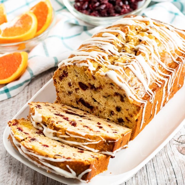 This Cranberry Bread Recipe is a nice holiday snack, breakfast or treat on your holiday table. Sweet cranberries and oranges are mixed together to create a quick bread and topped with a simple icing.