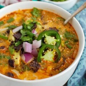 Step 3: Shred Chicken: Remove the chicken thighs and place on a cutting board. Use two forks to shred the chicken and then return it back to the pot. Stir everything together, serve in bowls and garnish with sour cream, avocado, cilantro, cheese and diced red onion.