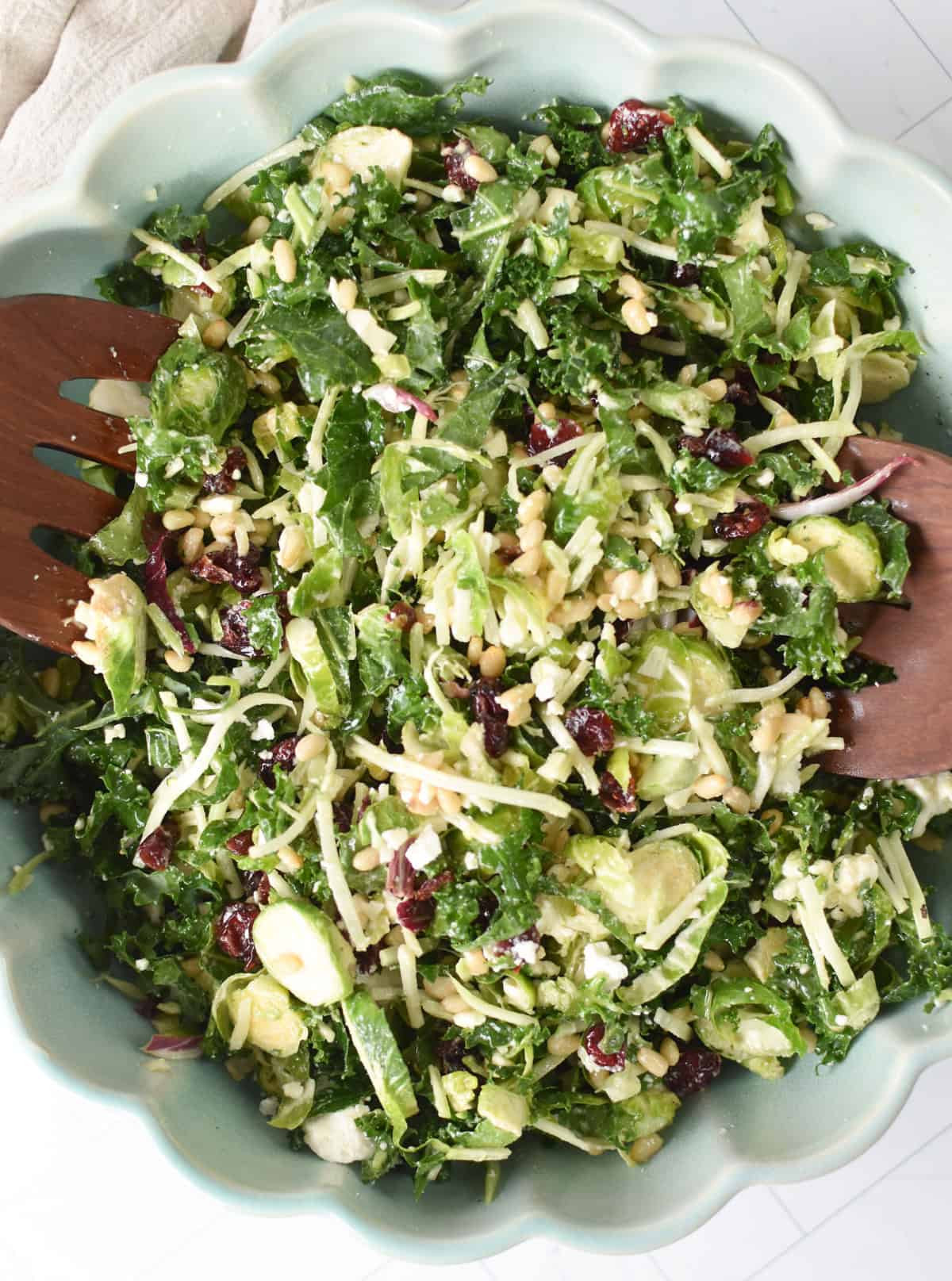 • Balance of Textures: This salad is the perfect balance of textures and flavors. The hearty kale, the crisp shaved brussels sprouts and a tangy dressing pairs nicely with sweet cranberries and feta. It is a great combination of flavors!