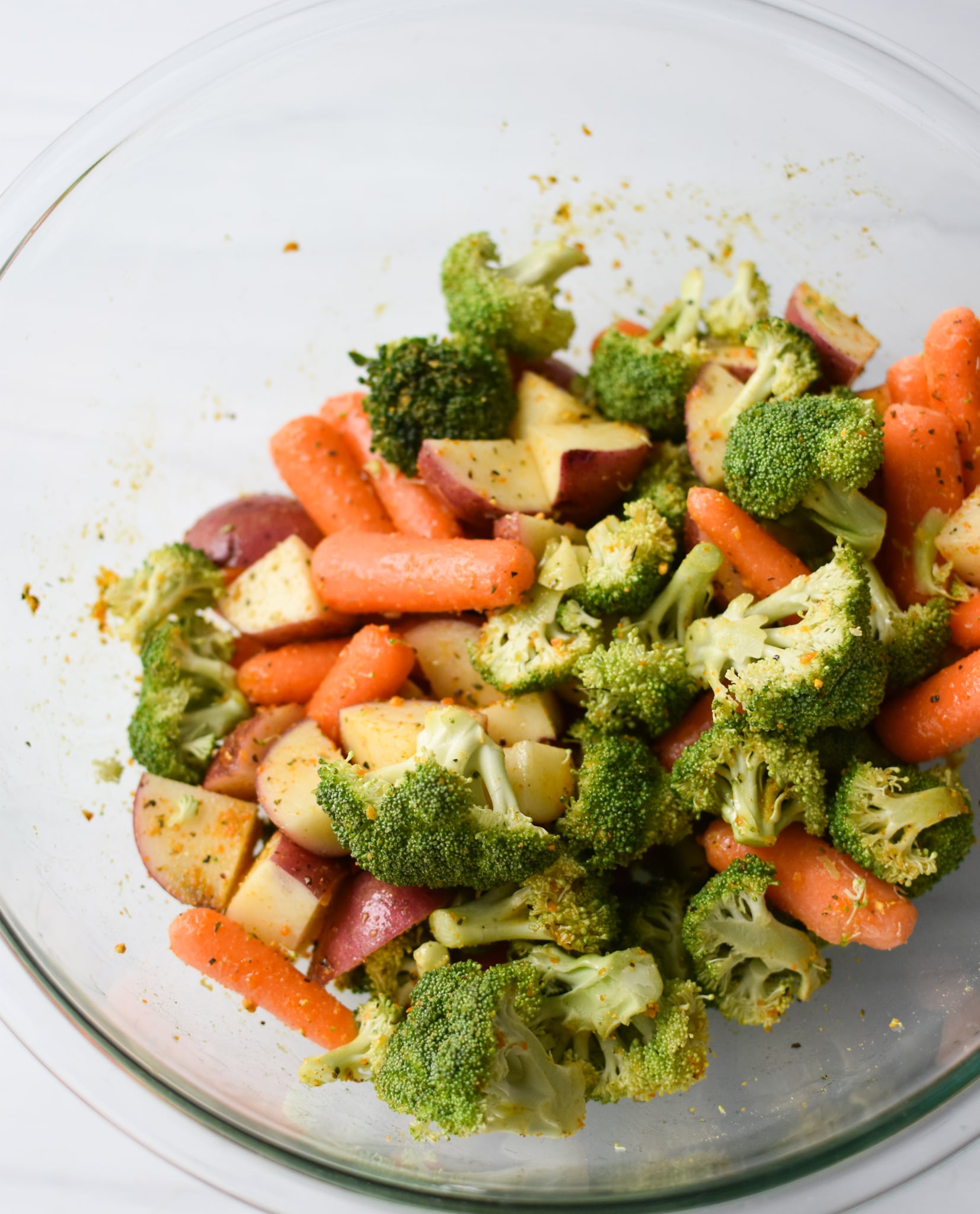 Step 1: Cut the Potatoes: Dice the potatoes into quarters. Add the vegetables and the potatoes in a large mixing bowl.